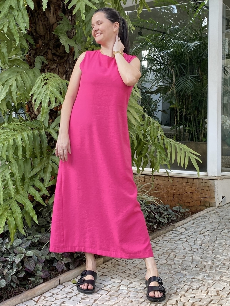 Vestido confeccionado no liocel, tecido com caimento protegido, confortável, elegante, modelagem maxi midi, gola O mais alta, cavado, fecho com um botão atrás e uma fenda nas costas.